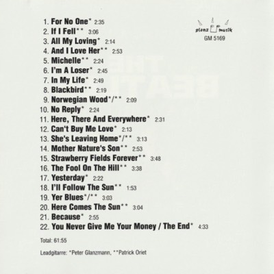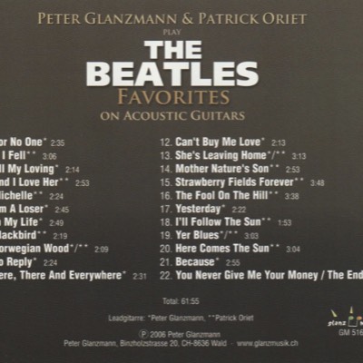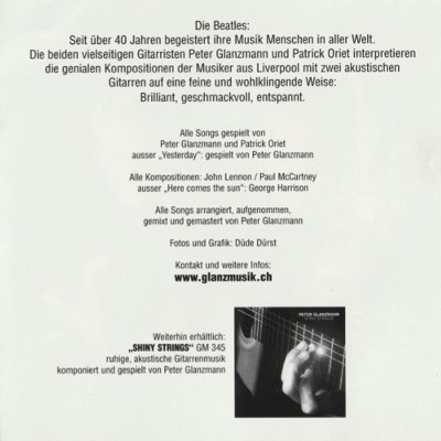 Seit über 50 Jahren begeistert ihre Musik Menschen in aller Welt. Die beiden vielseitigen Gitarristen Peter Glanzmann und Patrick Oriet interpretieren die genialen Kompositionen der Musiker aus Liverpool auf eine feine und wohlklingende Weise: