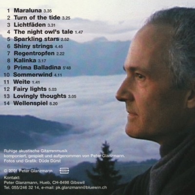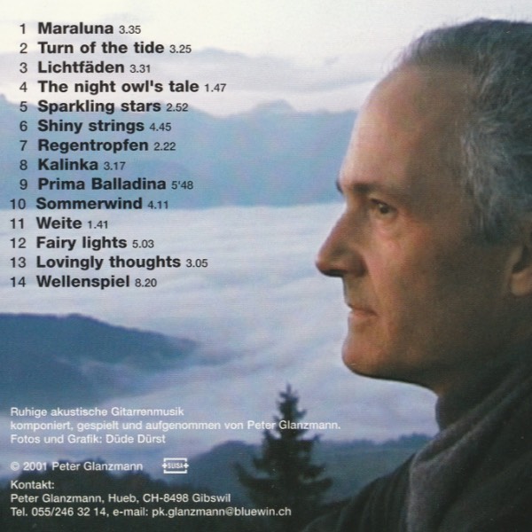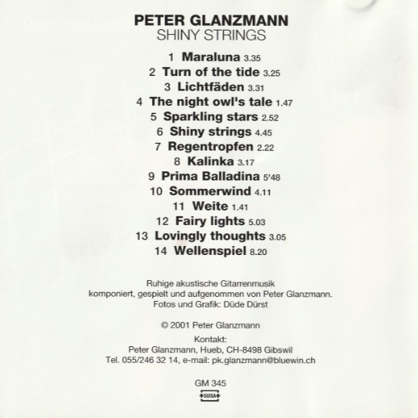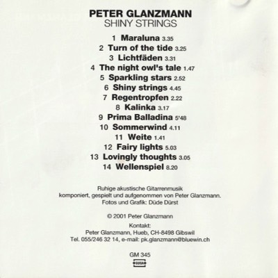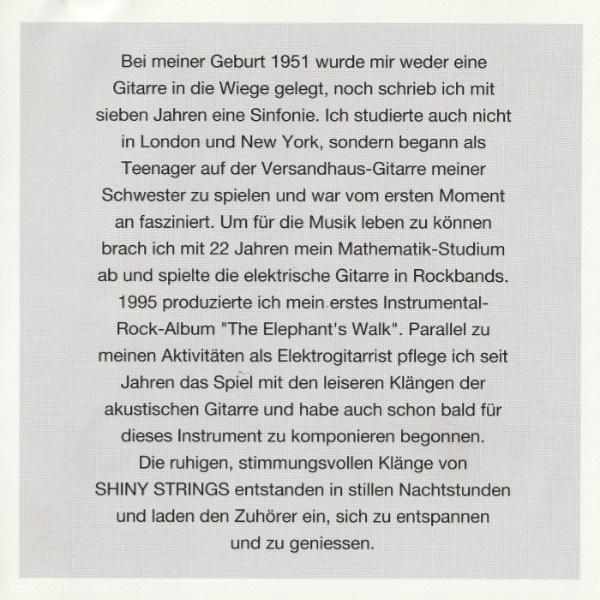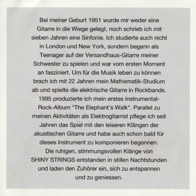 "Shiny Strings" enstand 2001 und enthält alles eigene Kompositionen. Ich wurde durch meine klangvolle Ramirez-Gitarre, die ich von Patrick Oriet erwarb inspiriert und nahm diese Instrumental-CD in meinem GlanzStudio auf. Bei einigen Stücken spielte ich zuerst eine Rhythmusgitarre und danach die Melodien.